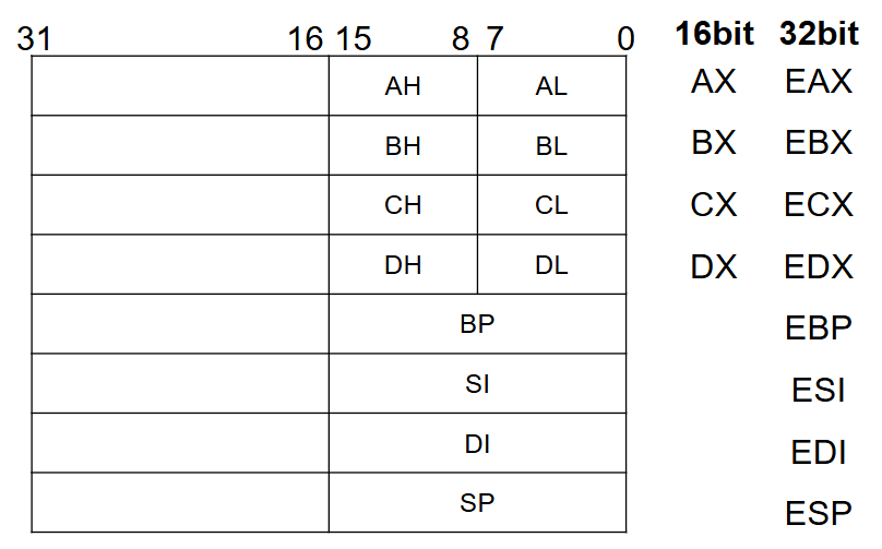 플래그 레지스터 / 32비트(4바이트) 크기 / 연산 결과 및 시스템 상태와 관련된 여러 가지 플래그 값 저장, 컴퓨터의 다양한 상태를 나타내는 비트를 포함하며 각 비트는 1과 0의 값을 가지며 True와 Fasle/ On과 Off, Set과 Clear를 의미
